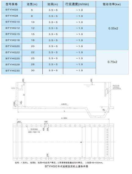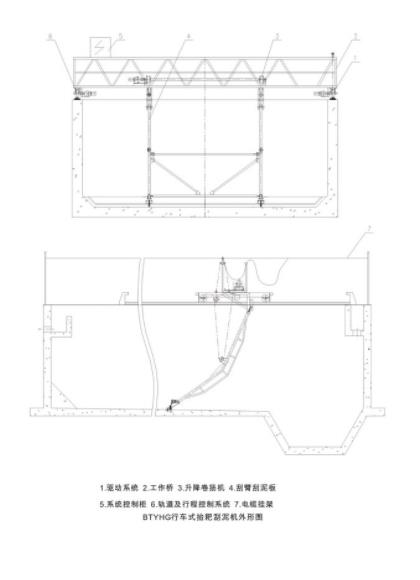 行车式能刮泥机由工作桥,卷扬机构,刮臂架,泥板,驱动机构、系统控制等成行车式刮泥机由四点支撑行走大梁横跨在平流式沉淀池上,双边驱动,池两边均铺设钢轨,翻泥机池台轨道从一端运行到另一端。运行时,泥板将泥砂甜入集槽中,回程时,甜臂架和泥板卷扬机构池底,完成一个行程,制泥机回到起始位置,两端行程开关控制其往复运行运行和伴车时间根据污量由时间能电器控制