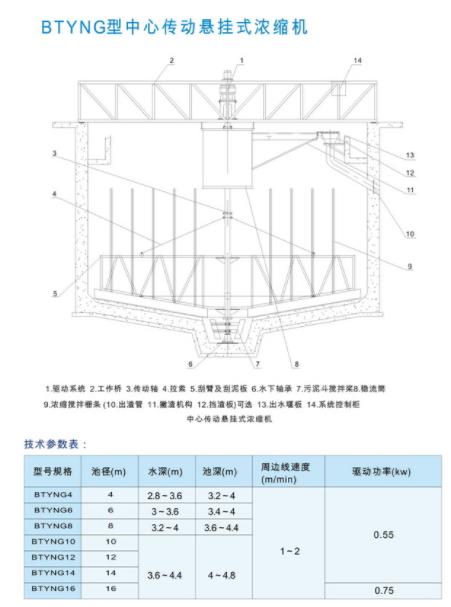 该机为中心传动悬挂式结构,不需中心支缴,简化土建结构。常用于池体径在3米至16米范围内。传通矩大,稳定性好,安装方便,维修简单。有矩保护,工作可靠,能进一步分浓缩污混中的自由水份以减少污泥体积,提高污泥浓效果,有利于提高沉淀效率