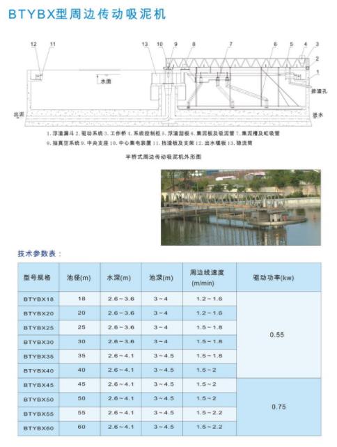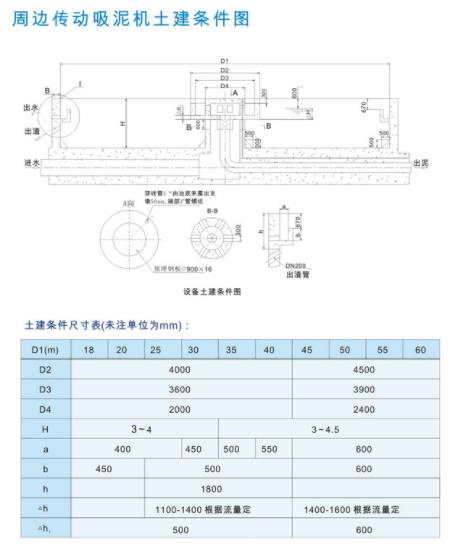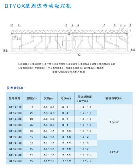 周边传动吸泥机根据出泥形式可以分为虹吸式和自流式。通常采用虹吸式,因其没有动密封,能够避免上清液短流。根据工作桥和吸泥管的区别可以分成全桥和半桥两种形式。虹吸式吸泥机由工作桥、吸泥管系,集泥槽、虹吸管抽真空系统、中心泥罐、中心支座、驱动机构、中心集电装置、电控箱等主件和出水三角板、稳流筒、挡板、浮刮板等附件(可选)成工作桥由安装在周边的驱动机构带动,绕安装在池中心支上的中心支座旋转、沉淀在池底的污泥由集泥板集至各吸泥口,在液位差作用下,污混经吸泥口、集泥槽、虹吸管、中心泥罐、排泥管排至池外,每个吸泥管上端设有描调节机构,以调节各吸混管的流量和浓度。液面上的浮在浮板和周边挡流板形成的缩区域内集中,由浮渣耙至集造斗,出池外设备外形图,技术参数和土建条件尺寸见图表。