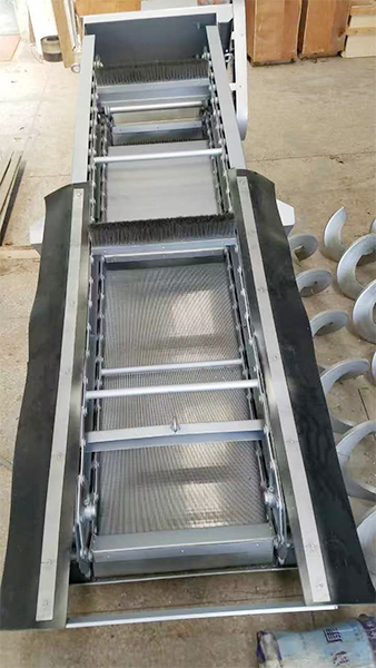 每台格栅有两条运输链条。安装时首先把运输链轮轴放到极限位置,待链条挂上后再升高大链轮轴到要求的位置。运输链条上安装着板刷,为避免板刷安装后出现倾斜,在安装运输链条时,应调整大链轮轴水平,这样装配后,才能保证板刷处于水平位置。