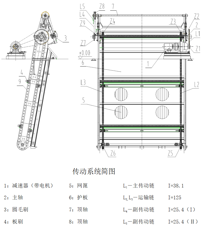 格栅的传动过程见上面的传动系统简图。电源合闸后,电动机、减速机开始传动,通过传动装置上的链轮Z1,带动链条L1,再经过Z2带动主轴3转动,主轴3使链轮Z5、Z4带动两根运输链L2、L3移动,Z5、Z6是运输链上的从动轮,它使运输链和板刷作回转运动。主轴上链轮Z7随主轴转动带动付链条L4,再经过并列链轮Z8带动付链条L5,从而使链轮Z9带动圆毛刷4转动。当板刷碰撞上圆毛刷时,圆毛刷以顶轴7为中心,逐渐摆开一定距离,再靠重力作用使圆毛刷对板刷产生挤压,达到清扫板刷上的污物之目的。板刷通过后,它凭重力又自动摆回原位,完成一个清扫动作,被清除的污物掉入冲渣槽内,被水冲走,实现全过程的清污。