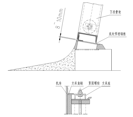 (5)骨架热膨胀间隙的控制和侧翼支承座的灌浆:下图中下段骨架离底坎予埋钢板△S=8mm间隙,是考虑骨架在零米层以下较长,安装闭合气温与当地历年极端气温差的热膨胀量,在施工过程中要严格保证。施工时,用δ=8mm厚钢板放在底坎钢板上把格栅垫起,按上部和顶部链轮轴调整水平。将格栅支承座用螺栓紧固于支承角钢上,进入预埋坑内灌浆。待沙浆凝固后,提起格栅稍许,抽出所垫钢板,即保证了8mm间隙。(如下图)。