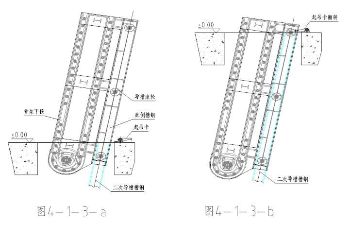 (2)下段机身的吊装:将下段机身的两下部底侧槽钢与二次预埋导轨槽钢相对套合,使槽钢、导轨、滚轮导入二次槽钢导轨内,随后使下段骨架缓慢下落,并使机身逐渐插入机坑,如下图(图4-1-3-a)。当下段骨架上端将与地面平齐时,翻转起吊架,使骨架上端处于坑口面上。如下图(图4-1-3-b)。