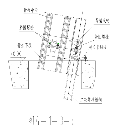 (3)起吊骨架中段:将起吊钢丝绳系于上部底侧槽钢的吊钩上,机身吊起,经定位销,销座定位后,分段联接螺栓,使下、中段机身紧固,合为一体,如图示(图4-1-3-c)。然后将整机起吊稍许,转动起吊卡,让整机沿二次预埋导轨缓慢下滑,至中段末端与地面平齐时,翻转起吊架,使中段骨架末端处于坑口面上。