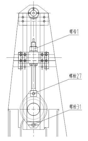 1)松开螺栓27、31,用长臂杆转动螺母I,使两条运输链松紧程度一致。调整后的链条在工作状态时(即工作边张紧)松边两个板刷间的链条弯曲垂幅值在15-22mm之间。