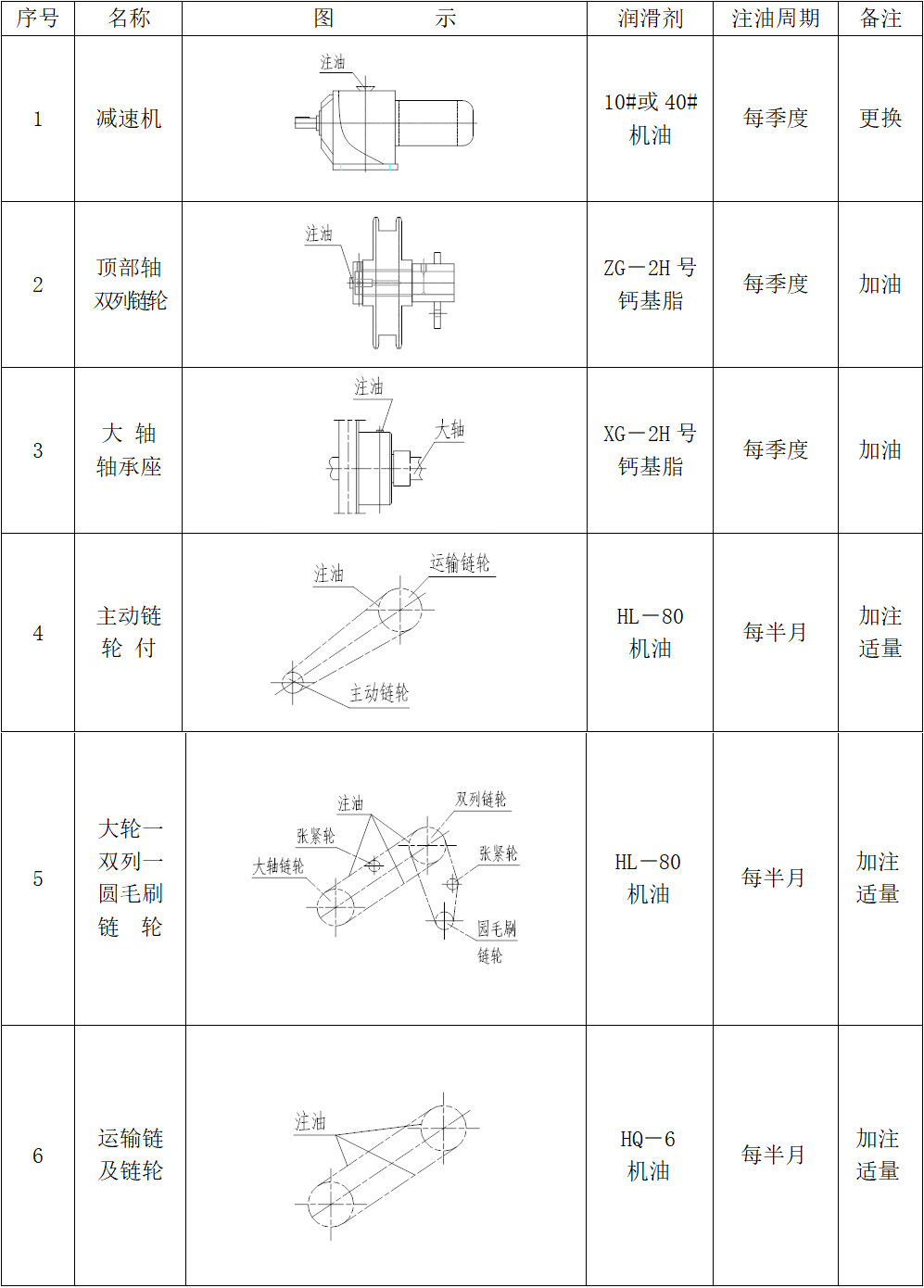 (2)格栅投入运行后,应定期对各要求润滑的部位,按要求进行加油润滑。(如润滑部位图)